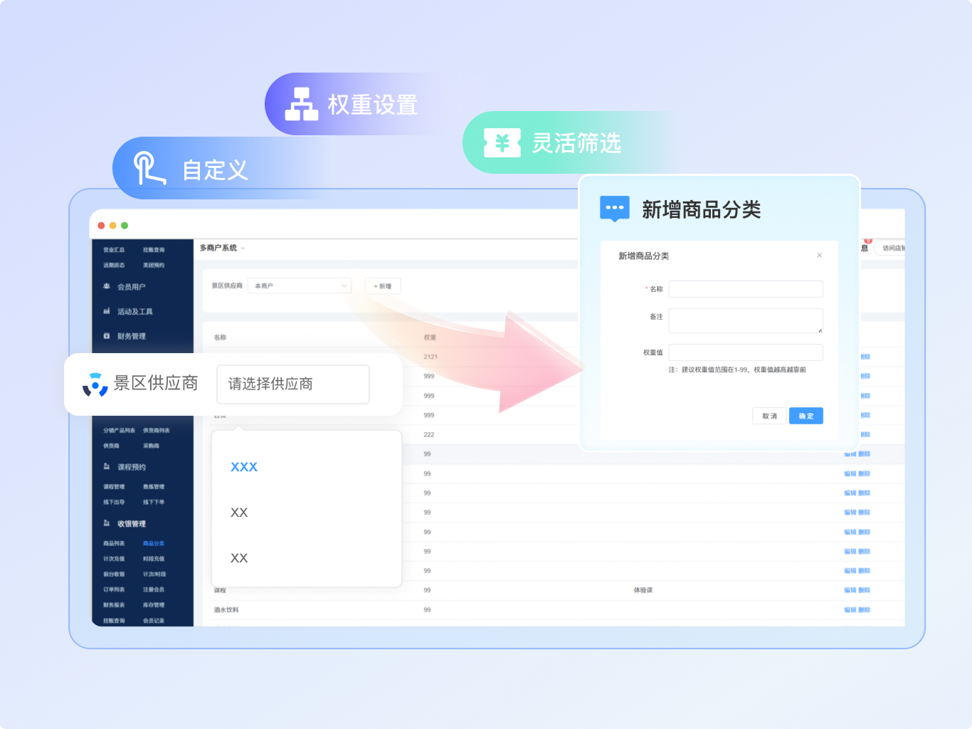 可灵活设置分类、售价、分账规则及会员卡关联,销售后系统自动结算,简化对账