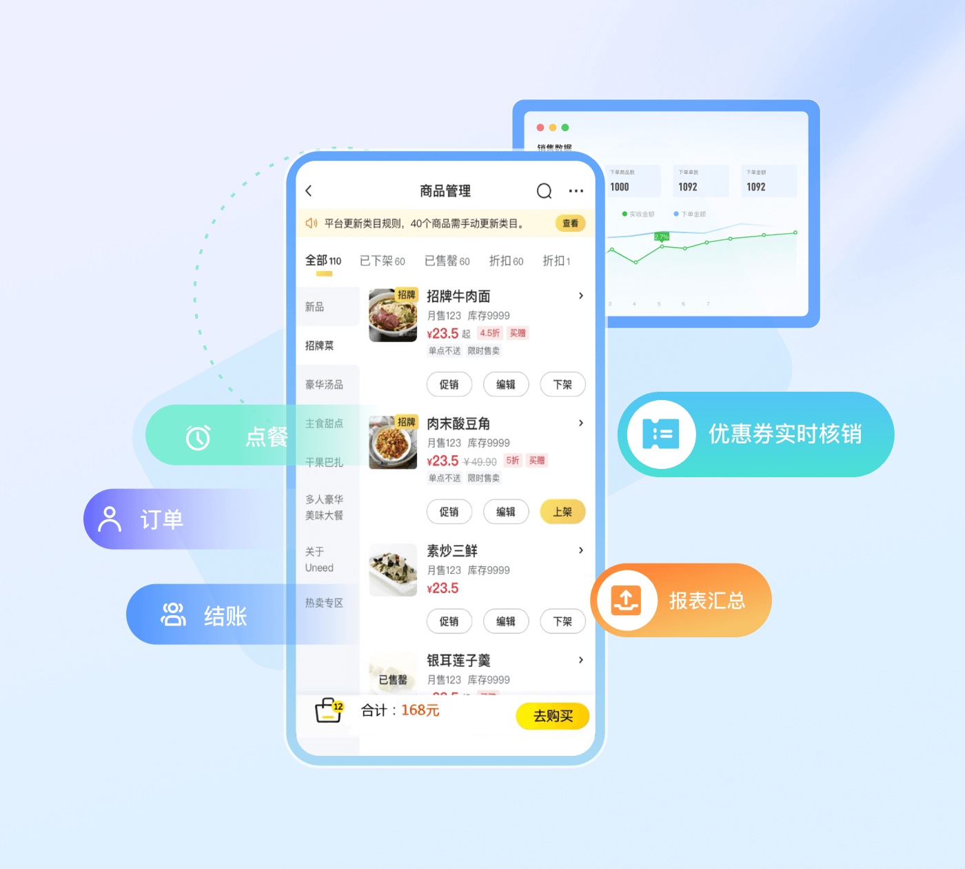 集点餐、订单、结账、券码核销与经营报表于一体,实现即点即传、实时核销与移动结算