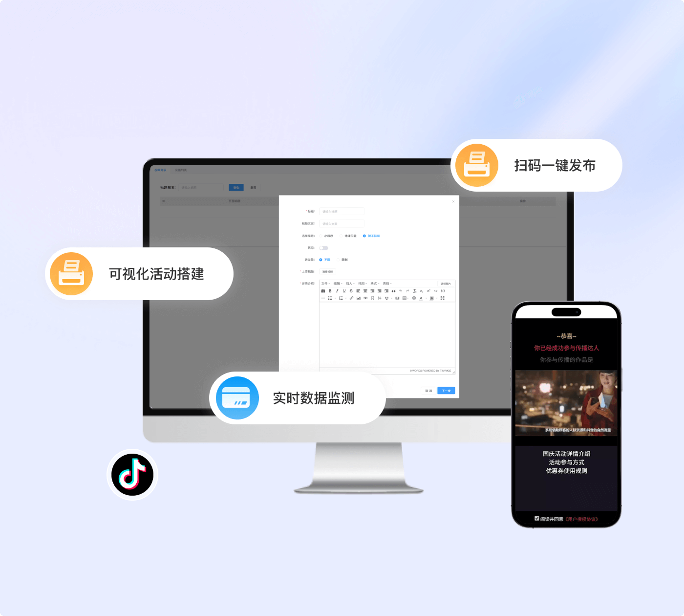 微商城支持6端(微信公众号、小程序、小红书、抖音、支付宝、快手)同步展示,提供50+营销活动及页面装修组件。