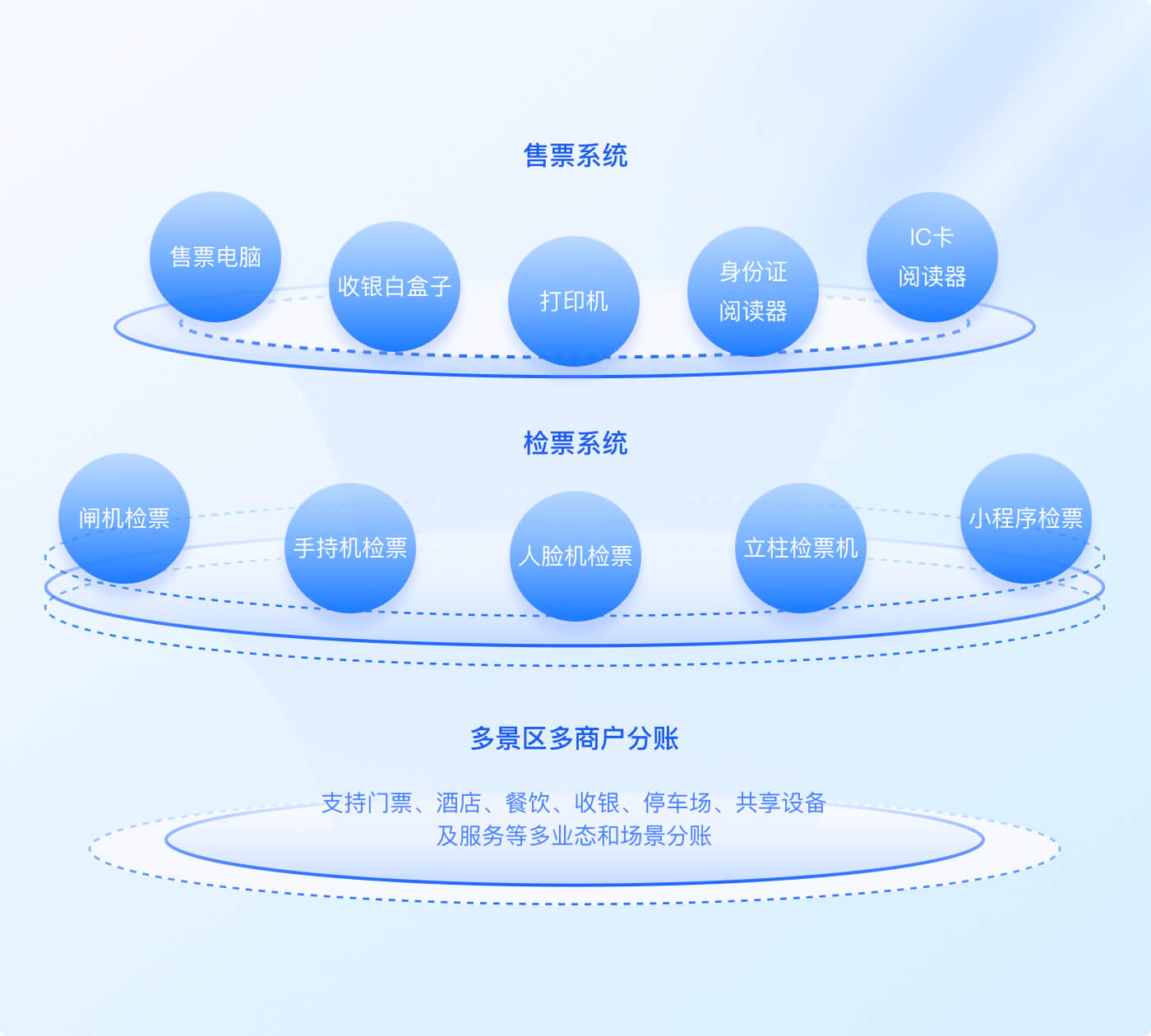 支持门票、酒店、餐饮、收银、停车场、共享设备及服务等多业态和场景分账