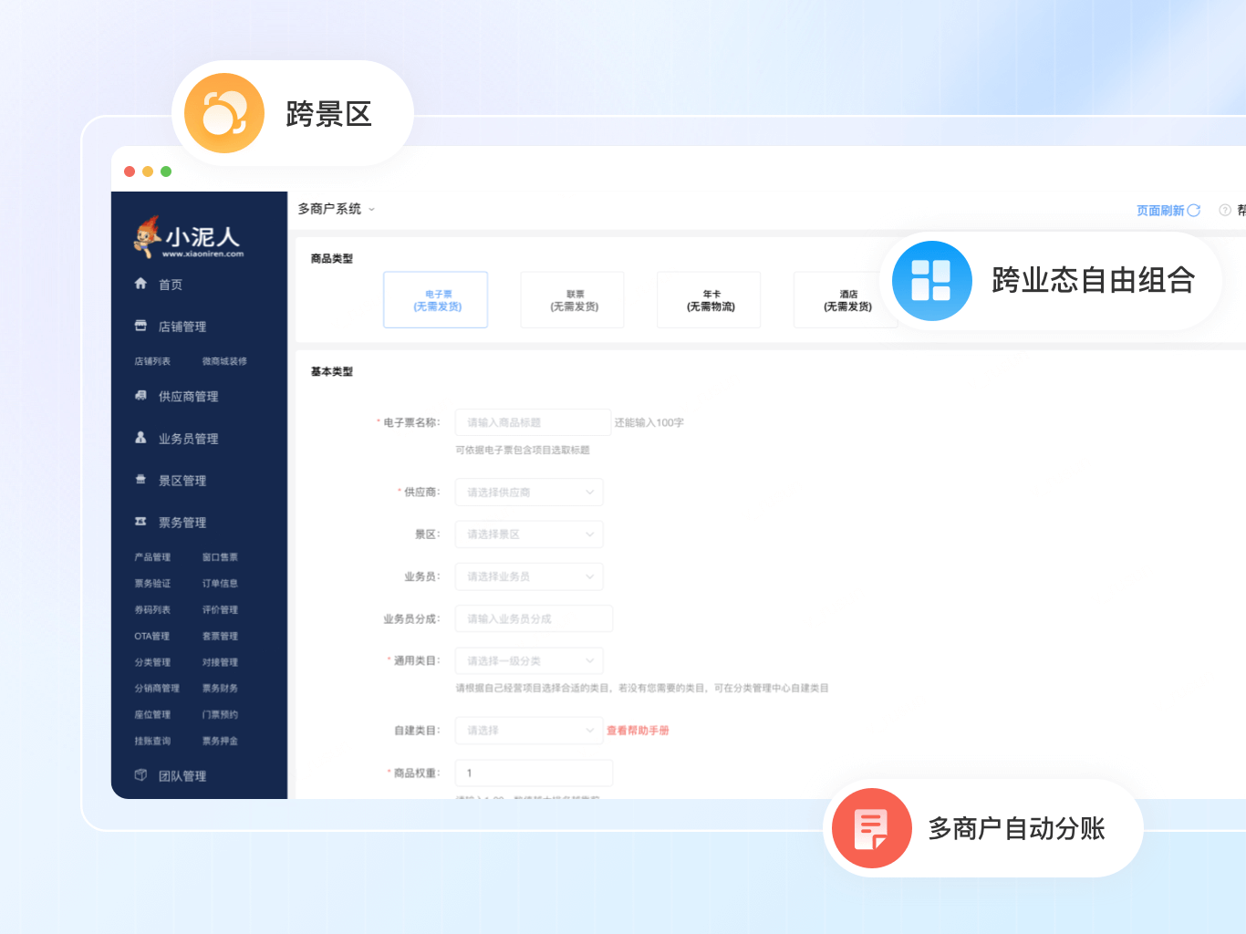支持跨景区、多业态票务自由组合与自动化分账配置