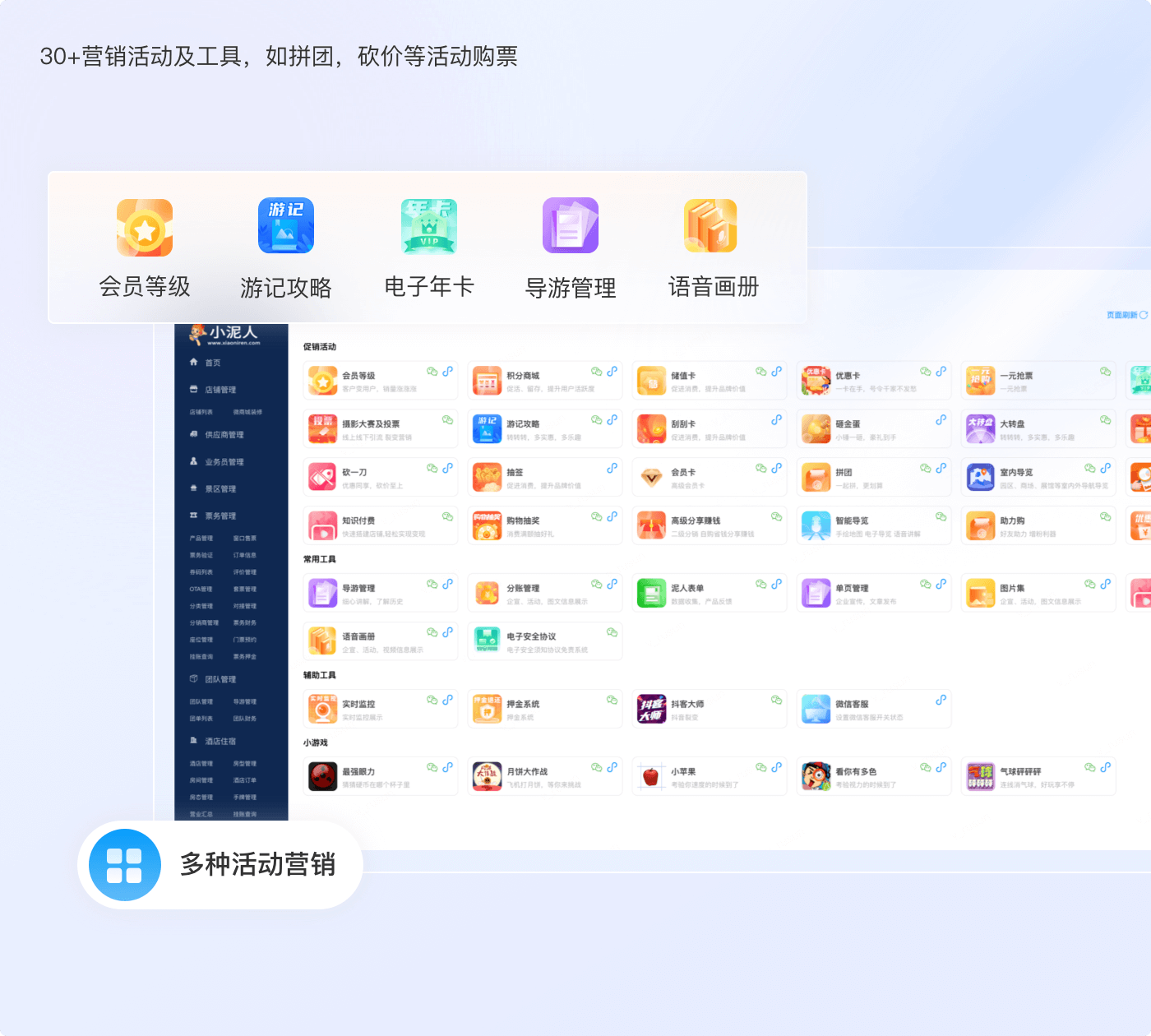 景区全链路解决方案包含完整的票务管理系统,涵盖售票、检票、会员管理、数据分析等全流程服务,提供堪比银行级的稳定性和安全性。
